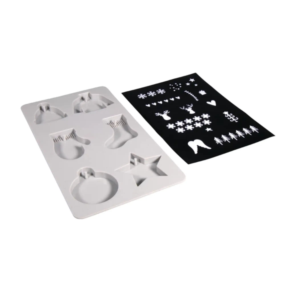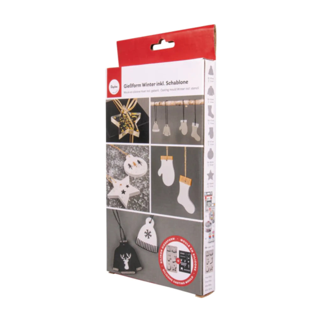 1 x Silikon Gießform Winter mit sechs Motiven und 1 x selbstklebende A5 Schablone