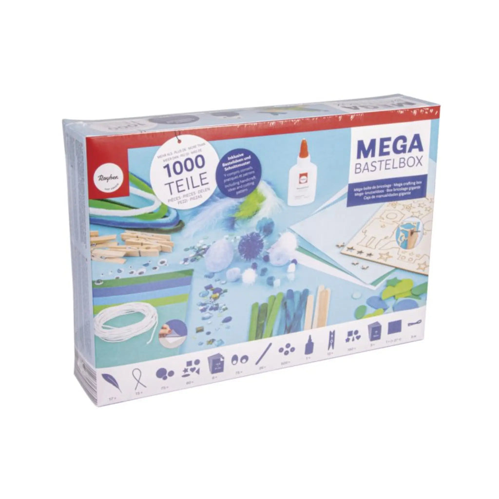 Die Mega‑Bastelbox Space mit 1.000 Teilen ist dein kreativer Fundus für unzählige Bastelideen – von Weltraum‑Themenprojekten bis zu fantasievollen Figuren oder Deko‑Objekten. Enthalten sind Materialien wie Wackelaugen, Pompons, Pailletten, Moosgummiformen, Bastelhölzer, Papier und vieles mehr, die sich perfekt kombinieren lassen. Alles ist in einer praktischen Aufbewahrungsbox sortiert, und kreative Bastelvorschläge helfen beim Einstieg.